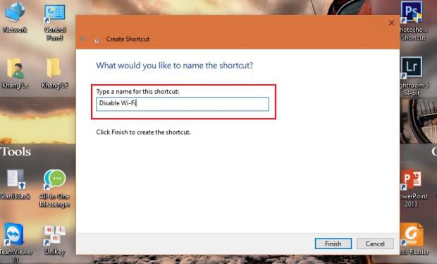Bạn hãy đặt tên cho shortcut là Disable Wi-Fi hay và nhấn Finish.