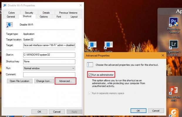 Tiếp theo, bạn cấp quyền quản trị viên cho các shortcut bằng cách click chuột phải tại đó và chọn Properties > Advanced > Run as Administrator, và nhấn OK.