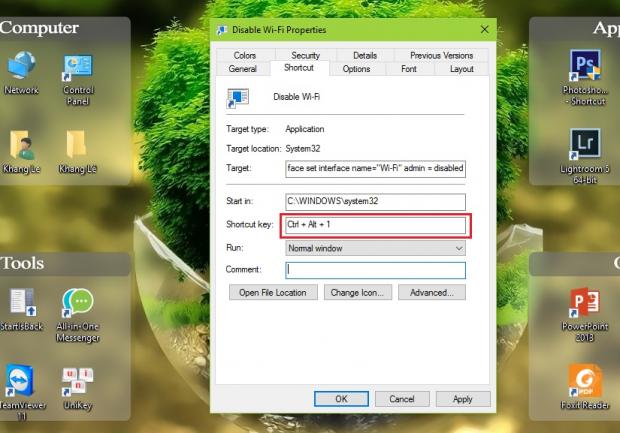 Cuối cùng, bạn gán phím tắt nhanh để có thể Bật hay tắt Wi-Fi một cách nhanh chóng bằng cách nhấp chuột phải lên một trong những shortcut và chọn Properties. Tại đây, bạn chọn ô Shortcut key và gán tổ hợp phím mình muốn.