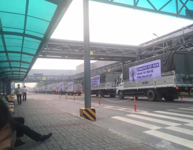 Vào ngày hôm nay (24/10), trên các trang mạng xã hội Facebook đã lan truyền một số hình ảnh khiến người xem không khỏi bất ngờ. Đó là hình ảnh hàng đoàn xe tải rồng rắn nối đuôi nhau với dòng chữ “Samsung Việt Nam chung tay ủng hộ đồng bào lũ lụt” được dán lên các thùng hàng. Theo thông tin chú thích, những hình ảnh này được cho là ghi lại tại nhà máy Samsung thuộc huyện Yên Phong, tỉnh Bắc Ninh.