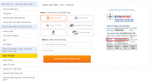 Tại giao diện chính của trang, kéo xuống phía dưới để chọn các tùy chọn thích hợp cho riêng bạn. Tuy nhiên hiện nay hệ thống chỉ hỗ trợ chủ yếu nhu cầu thanh toán điện, nước ở thành phố Hồ Chí Minh, và thủ đô Hà Nội.