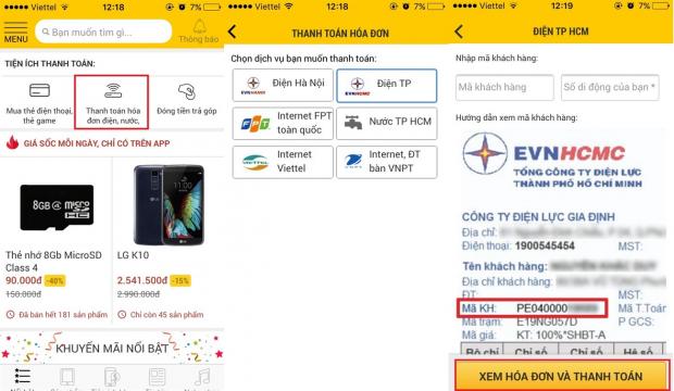 Ví dụ, chọn tùy chọn Thanh toán Điện TP.HCM. Người dùng sẽ chỉ cần nhập 2 ô trống là mã khách hàng và số điện thoại khách hàng. Sau khi nhập xong chọn Xem hóa đơn và thanh toán.
