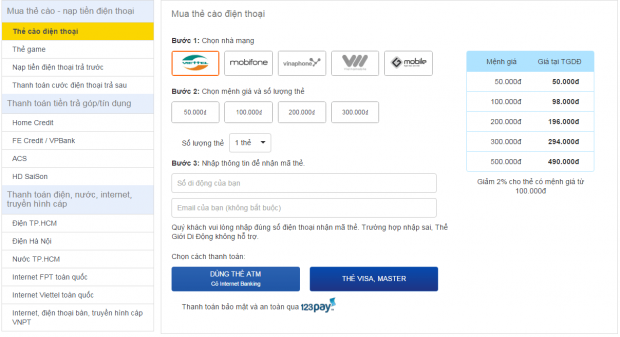Thế giới di động cho phép người dùng có thể nạp tài khoản từ 50.000 đồng đến 500.000 đồng và chiết khấu 2% cho các thẻ có mệnh giá từ 100.000 đồng trở lên.