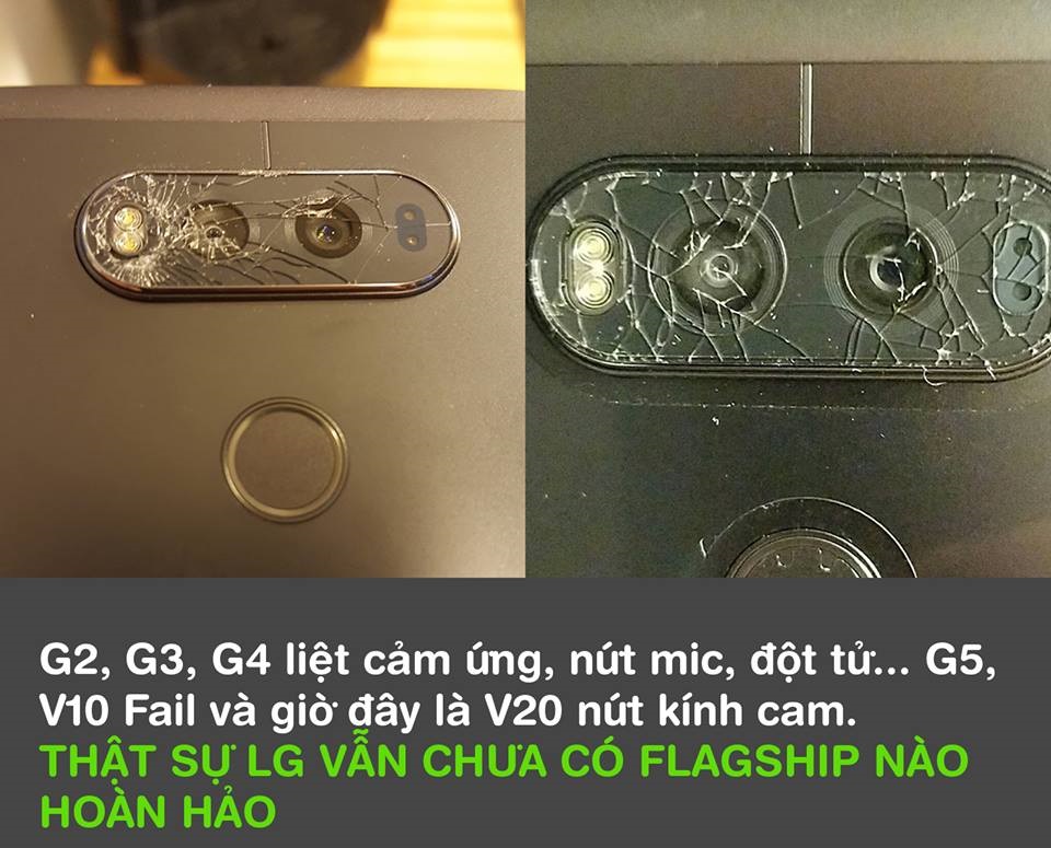 Và mới đây nhất, cao cấp nhất chính là LG V20, mặt kính phía sau được cho là rất “mong manh dễ vỡ”, nhiều người bật đèn flash quên tắt cũng có thể khiến mặt kính bảo vệ camera nứt rạn. Nguyên nhân được cho là do LG dường như không dùng kính Sapphire để phủ mặt kính mà chỉ dùng kính cường lực thông thường. Tuy nhiên chúng ta sẽ phải chờ kết quả điều tra chính thức của LG.