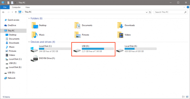 Đầu tiên, bạn hãy cắm USB vào máy tính và mở My Computer. Tại đây, bạn sẽ thấy USB tên là “USB”, tên ổ USB là “D”.