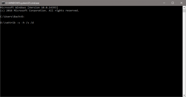 Tiếp theo, bạn cần nhập tên ổ USB của bạn vào cửa sổ Command. Chiếc USB sử dụng trong bài viết này có tên ổ là G, như vậy sẽ cần nhập “G:” vào cửa sổ Command Prompt rồi nhấn Enter. Nếu tên ổ USB của bạn là F hay E thì nhập vào “F:”, “E:”. Sau đó, tiếp tục nhập thêm câu lệnh “attrib –s –h G:* /s /d” và nhấn Enter.