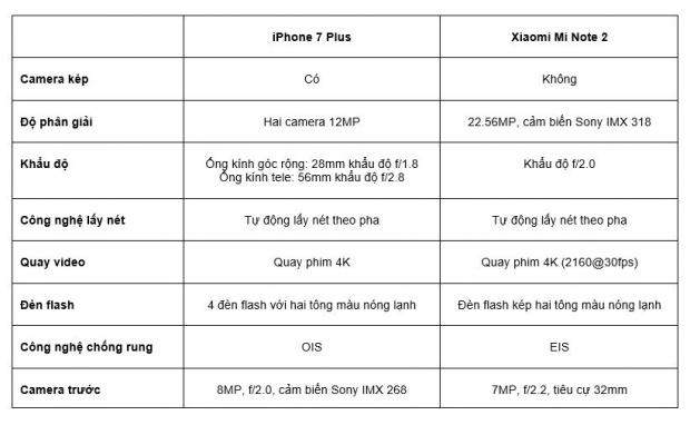 Trước hết hãy cùng so sánh thông số kỹ thuật camera giữa iPhone 7 Plus và Mi Note 2 :