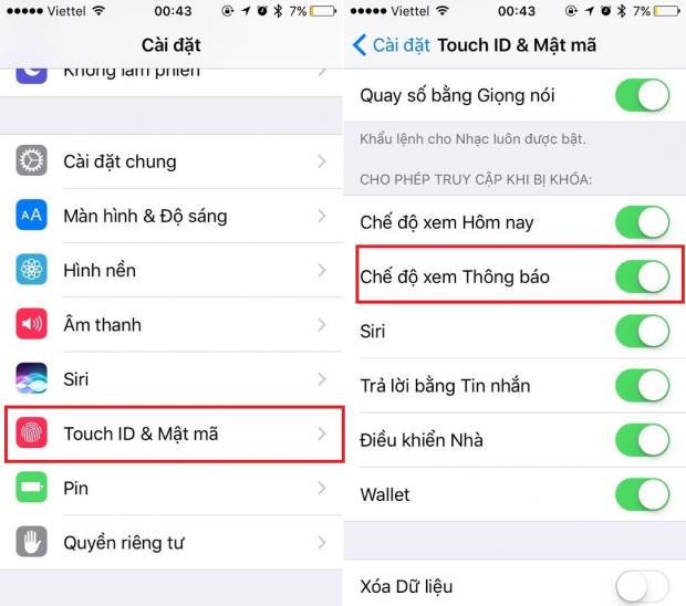 Vào Cài đặt, chọn Touch ID & mật mã, sau đó cuộn xuống dưới, chọn Cho phép truy cập khi bị khóa và tắt đi các ứng dụng bạn không muốn hiển thị thông báo.