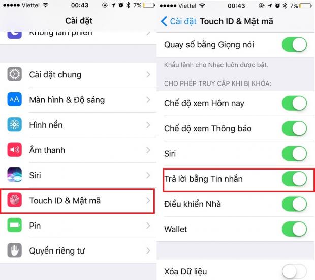 Vào Cài đặt, chọn Touch ID & mật mã, sau đó cuộn xuống dưới, chọn Trả lời bằng tin nhắn và gạt tắt tính năng này.