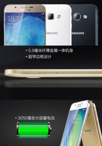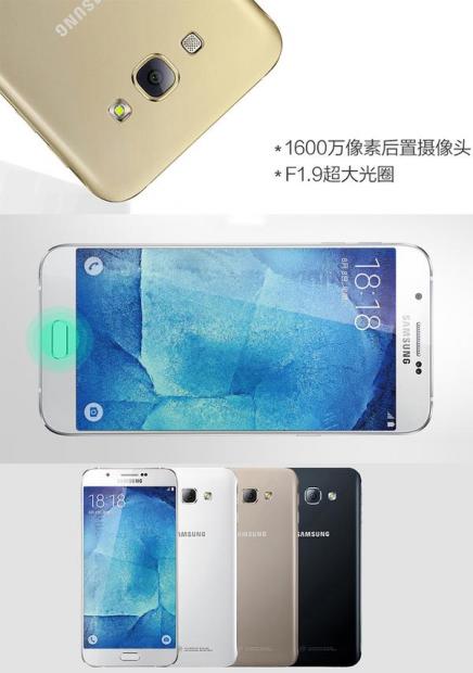 Các chi tiết cấu hình được ghi chú trên các bức ảnh như độ mỏng của Galaxy A8 chỉ 5.9 mm, máy ảnh 16MP với khẩu độ F/1.9, rất rộng, một máy quét vân tay được tích hợp ngay trong nút Home, viền cạnh màn hình mỏng hơn và thỏi pin dung lượng 3.050mAh. Các thông số kỹ thuật khác bao gồm màn hình 5.7 inch full HD, bộ vi xử lý Snapdragon 615 cùng bộ nhớ RAM 2GB.