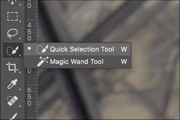 B2: Chọn Quick Select Tool từ thanh công cụ. Phím tắt cho công cụ này là W. Nếu mặc định của chương trình là Magic Wand Tool thì bạn hãy nhấn tổ hợp phím Shift + W để đổi sang Quick Select Tool. Công cụ này sẽ chọn những pixel ảnh giống như vùng ảnh bạn click.