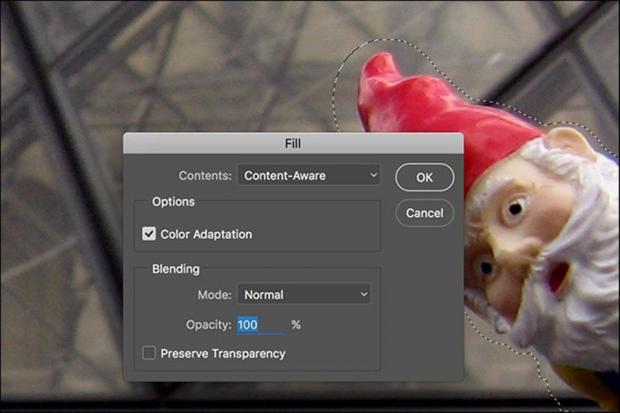 B5: Đây là nơi điều kì diệu xảy ra: điều hướng đến Edit> Fill và chọn Content-Aware từ menu Content. Nhấn OK và Photoshop sẽ phân tích khu vực xung quanh vùng ảnh bạn đã chọn để tiến hành “xóa” đối tượng.
