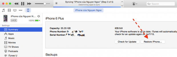 Bước 8: Giờ thì iTunes sẽ bắt đầu tiến hành restore lại thiết bị của bạn về iOS 8.4. Cứ để cho máy làm, quá trình này mất khoảng 10-20 phút tùy máy. Sau khi restore xong thì bạn có thể thiết lập iPhone, iPad của mình như là một chiếc máy mới hoặc khôi phục lại từ một bản backup 8.4 trước đó (lưu ý là backup của iOS 9 sẽ không xài được cho 8.4 đâu nhé).