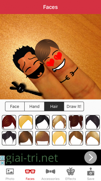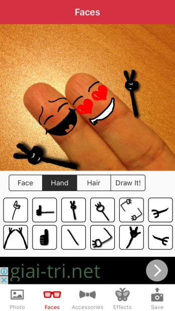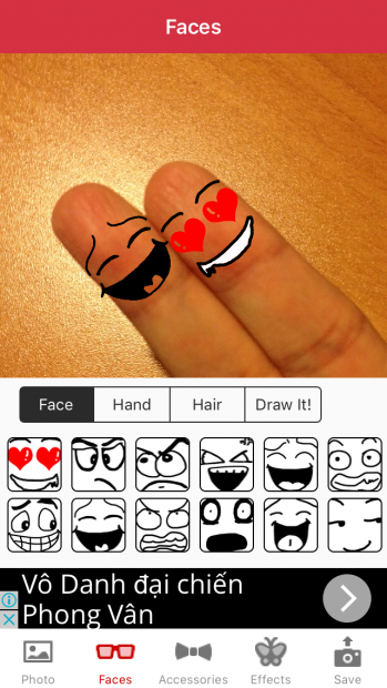 Tiếp theo, bạn sẽ bắt đầu trổ tài vẽ vời của mình bằng cách nhấn vào lựa chọn 'Faces' để thêm các khuôn mặt ngộ nghĩnh. Ở bước này, bạn chỉ cần chọn khuôn mặt mình thích, sau đó phóng to ngón tay lên để đặt khuôn mặt vào sao cho khớp và đẹp nhất.
