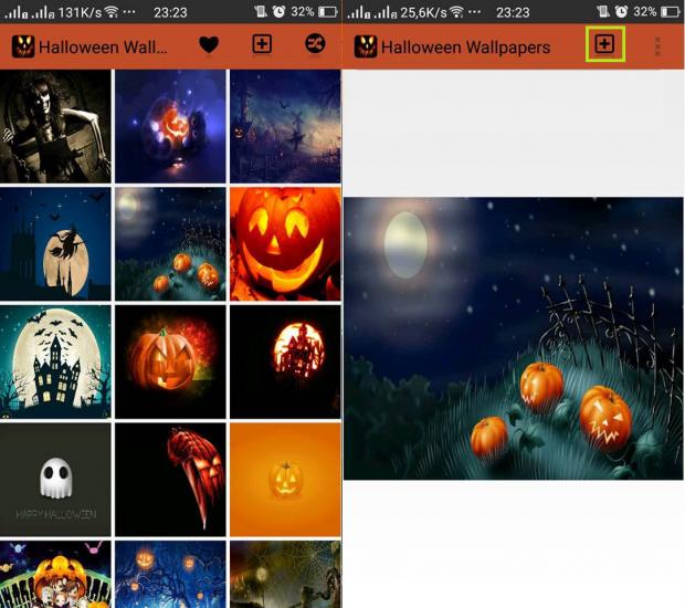 Ứng dụng là một kho hình nền Halloween để cho bạn có thể tha hồ lựa chọn. Nếu muốn cài ảnh nào làm hình nền thì chỉ cần nhấn vào dấu '+' là xong.