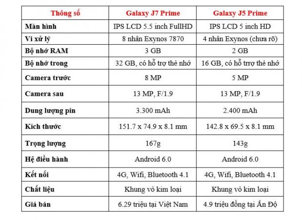 Về thiết kế, cả 2 đều giống nhau với vật liệu kim loại nguyên khối, chỉ có màn hình kích thước khác nhau vì vậy mà kích thước của máy cũng khác nhau. Thông số cấu hình của Galaxy J7 Prime nhỉnh hơn và tất nhiên giá bán cũng cao hơn, mời bạn xem cụ thể dưới đây: