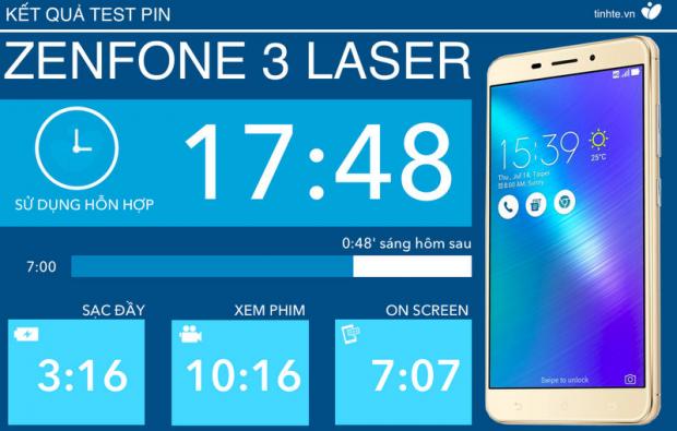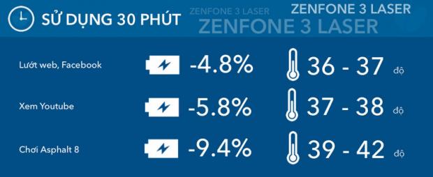 Thử nghiệm thực tế cho thấy dù sở hữu viên pin dung lượng 3000mAh nhưng Zenfone 3 Laser cho thời gian sử dụng hỗn hợp lên tới 17 tiếng 48 phút và on screen được hơn 7 tiếng một chút. Và tương tự như các smartphone có vỏ làm từ kim loại khác, dù mang đến vẻ sang trọng nhưng nó cũng khiến người dùng khó chịu vì khả năng dẫn nhiệt tốt khiến máy nhanh bị nóng lên trong quá trình sử dụng.