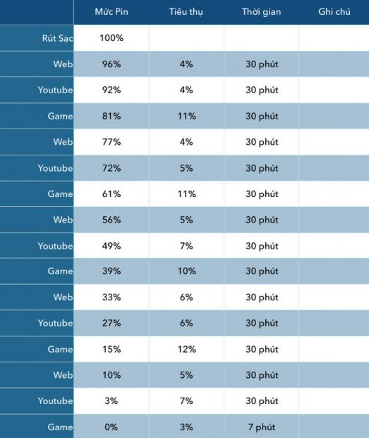- Tiến hành thử nghiệm mỗi tác vụ trong vòng 30 phút cho đến khi hết pin bao gồm: lướt web (web + chat + fb + đọc báo), xem Youtube, chơi game (Asphalt 8), sử dụng tất cả bằng WiFi.