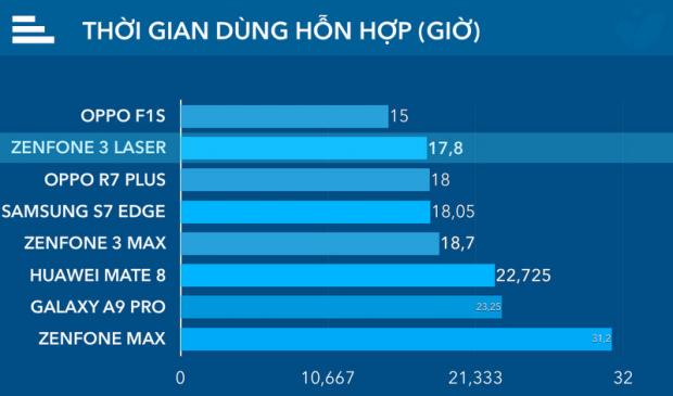 Dù được trang bị viên pin có phần yếu thế hơn so với người anh em Zenfone 3 Max (3000mAh so với 4130mAh) nhưng thử nghiệm thực thế cho thấy Asus Zenfone 3 Laser cho thời lượng sử dụng pin không kém phần ấn tượng.