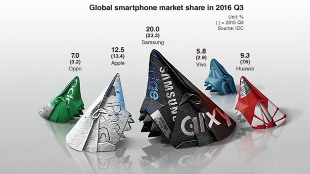 Theo Sammobile, công ty nghiên cứu thị trường IDC đã tiết lộ rằng Samsung đã sản xuất và đưa ra thị trường 72.5 triệu chiếc smartphone trong quý 3 vừa qua, chiếm thị phần 20% (giảm 2.1%), tuy nhiên 3 nhà sản xuất gồm Huawei, OPPO và Vivo tổng cộng tung ra thị trường 80.1 triệu chiếc, chiếm 22.1% (tăng 1.3%) trên thị trường toàn cầu.