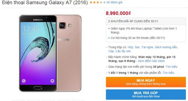 Cụ thể, Galaxy A7 2016 với thiết kế đẹp mắt, khung nhôm kết hợp 2 mặt kính cường lực Gorilla Glass 4 đã được giảm giá mạnh từ 9.99 triệu xuống còn 8.99 triệu đồng, giảm 1 triệu đồng.