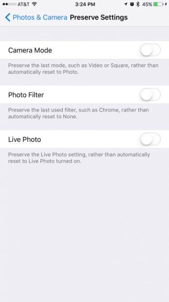 Như đã nói ở trên, ứng dụng camera sẽ được bổ sung thêm tính năng Preserve Camera Settings trên iOS 10.2. Thay vì khởi động lại toàn bộ thiết lập camera sau khi tắt ứng dụng như chế độ tự động, tính năng này cho phép người dùng giữ nguyên thiết lập camera của lần sử dụng trước đó, bao gồm bộ lọc ảnh và thiết lập Live Photos.
