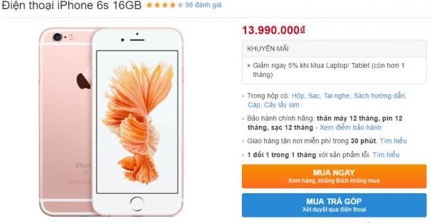 Cụ thể, iPhone 6s 16 GB đã được hạ giá từ 16.99 triệu xuống còn 13.99 triệu đồng, giảm tới 3 triệu đồng. Với phiên bản 16 GB thì đây là lần đầu tiên nó được giảm giá sốc đến như vậy, trước đó chỉ giảm với từng mức như 1-2 triệu đồng mà thôi, như vậy, đây là mức giá thấp nhất từ trước tới nay đối với mẫu iPhone này và nó về ngang với mức giá của iPhone 6 16 GB, hay iPhone SE 64 GB.