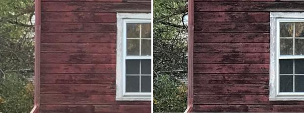 Trong trường hợp đầu tiên, chúng tôi quyết định so sánh khả năng zoom của iPhone 7 và iPhone 7 Plus trong điều kiện ánh sáng khá thuận lợi. Nhìn qua thì tổng thể bức ảnh của cả hai khá giống nhau nhưng khi phóng to lên chúng ta có thể dễ dàng nhận ra rằng iPhone 7 Plus đã làm tốt hơn trong việc giữ lại chi tiết chung cả bức tường gỗ, căn nhà chung cư hay tán lá bên trái ngôi nhà.