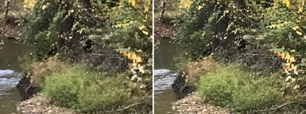 Ở cảnh 2 này, iPhone 7 Plus một lần nữa chứng minh tính ưu việt của zoom quang học. Khi phóng to lên chúng ta có thể thấy rằng độ chi tiết của tán lá ở bờ phải của nguồn nước thanh bình này trên iPhone 7 rõ ràng là kém xa so với những gì mà ống kính tele trên iPhone 7 Plus thu được.