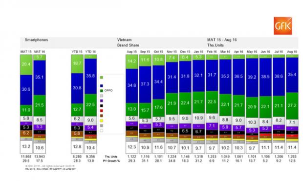 Hãng nghiên cứu thị trường GFK cho biết, OPPO đang tăng trưởng rất mạnh tại phân khúc tầm trung. Cụ thể, phân khúc smartphone 5-7 triệu đồng của hãng này đã tăng gấp 2 lần, từ 10,3% lên 19.9% so với cùng kỳ năm ngoái.