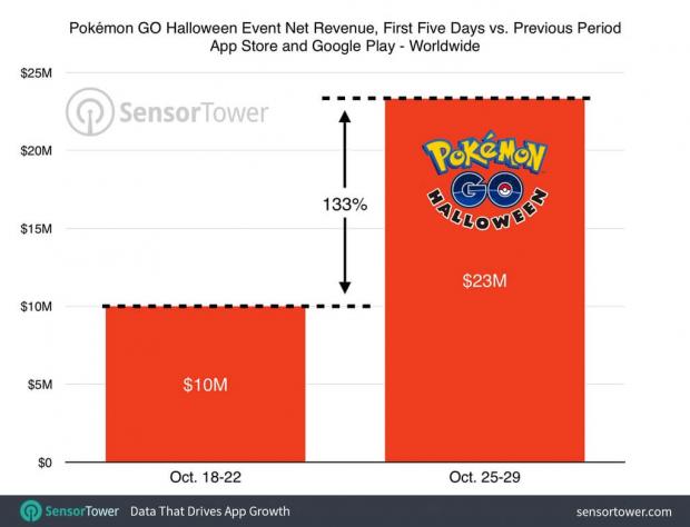 Theo phân tích từ hãng SensorTower được techcrunch đăng tải thì doanh thu từ trò chơi Pokemon Go trong thời gian diễn ra sự kiện Halloween từ ngày 25/10 đã tăng 2.3 lần so với tuần trước, đỉnh điểm là ngày 29/10.