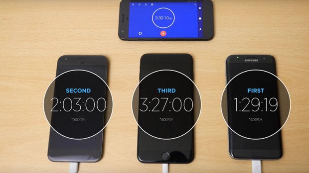 Bộ ba flagship đình đám đều được sử dụng đến mức 1% pin và bắt đầu tiến hành sạc. Kết quả khá bất ngờ khi Galaxy S7 Edge với viên pin 3.600 mAh lại về đích đầu tiên với gần 1 giờ 30 phút sạc, trong khi đó Pixel XL đã hoàn thành 84% con đường, iPhone 7 Plus bị bỏ xa phía sau với chỉ 54%.