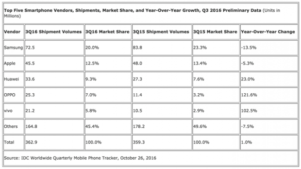 Các thương hiệu khác bán được tổng cộng 164,8 triệu máy chiếm 45,4% thị phần giảm 7,5% so cùng kỳ năm ngoái. Xét về tổng sản lượng, tất cả các nhà sản xuất đã tiêu thụ được 362,9 triệu chiếc điện thoại trên toàn thế giới vào quý III/2016, tăng nhẹ 1% so với cùng kỳ năm ngoái.