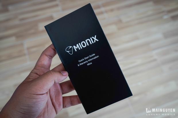 Mặt dưới với các thông tin về chuột, mắt đọc đặt chính giữa nằm bên trong logo Mionix rất độc đáo.