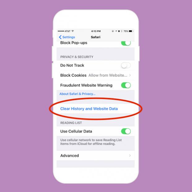 Để thực hiện, truy cập Settings > Safari sau đó kéo xuống dưới và chọn Clear History and Website Data. Một cửa sổ hiện lên yêu cầu người dùng xác nhận xóa cache.
