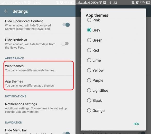Tại đây, bạn có thể chọn mục Web themes để thay đổi giao diện hay App themes để đổi màu ứng dụng. Có rất nhiều màu có thể cho bạn lựa chọn thoải mái.