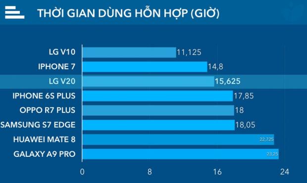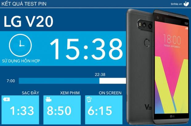 Dù sở hữu viên pin không quá lớn so với người tiền nhiệm nhưng thời lượng pin LG V20 lại cho kết quả rất ấn tượng với hơn 15 tiếng sử dụng hỗn hợp.