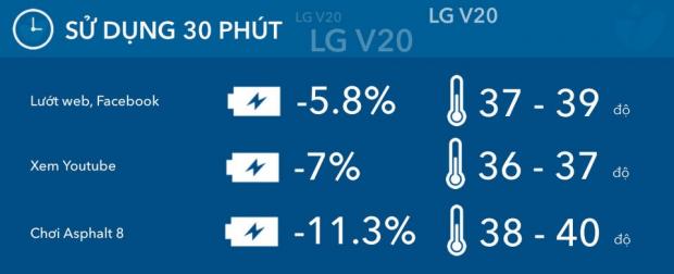 Dù sở hữu viên pin không quá chênh lệch so với người tiền nhiệm nhưng khi so sánh về thời lượng pin với LG V10 thì V20 có cải tiến rất rõ rệt. Qua thử nghiệm, thời gian on screen của máy là 6 tiếng 15 phút, từ đó suy ra thời gian sử dụng hỗn hợp của máy có thể lên đến 15 tiếng 38 phút. Hiểu một cách đơn giản là, nếu bạn sạc đầy pin và rút ra lúc 7h sáng thì đến 22h38 phút cùng ngày máy mới hết pin, quá đủ cho một ngày sử dụng. Ngoài ra thì thời lượng sử dụng pin này còn phụ thuộc khá nhiều vào nhu cầu sử dụng của người dùng, nếu bạn chỉ thực hiện những tác vụ nghe gọi hay lướt web đơn thuần thì thời gian có thể kéo dài hơn. Ngược lại, nếu bạn thường xuyên chơi game hay truy cập internet, xem video hay check mail thì thời lượng sử dụng pin sẽ giảm xuống.