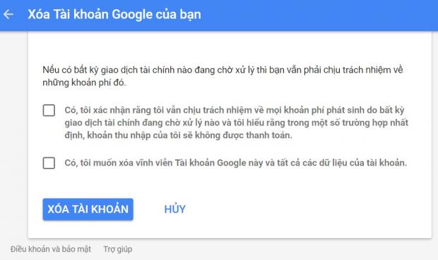 Ở đây có 2 tuỳ chọn cho người dùng có thể lựa chọn là Xoá sản phẩm nếu bạn muốn xoá các dịch vụ của Google, hoặc Xoá tài khoản và dữ liệu Google để xoá toàn bộ dữ liệu và tài khoản của mình.