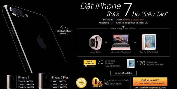 Tại hệ thống siêu thị Thế giới di động, để mua được phiên bản Jet Black, khách hàng đặt màu này sẽ tham gia quay số và chỉ chọn 210 khách hàng may mắn được mua mỗi ngày. Trong 210 suất này, có 100 suất iPhone 7 128 GB, 10 suất iPhone 7 256 GB, 80 suất iPhone 7 Plus 128 GB và 20 suất iPhone 7 Plus 256 GB.