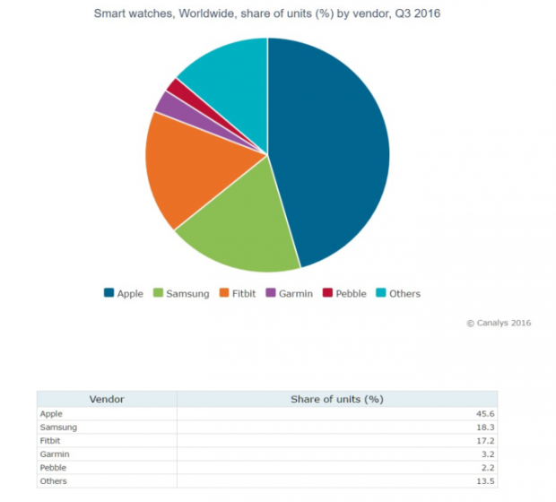 Apple Watch vẫn đang nắm giữ ngôi vương. Theo số liệu thống kê của Canalys, Apple Watch chiếm 46%, còn số liệu của IDC thì cho rằng con số này chỉ là 41%. Các vị trí còn lại trong bảng xếp hạng của Canalys gồm: Samsung (18%), Fitbit (17%), Garmin (3%) và Pebble với 2%. Còn với số liệu của IDC Garmin chiếm 21% tiếp theo là Samsung (14%), Lenovo và Pebble, mỗi hãng chiếm 3%. IDC đã sử dụng dữ liệu của mình để chứng minh rằng: “smartwatch không phải dùng cho tất cả mọi người”, nhưng Canalys vẫn đưa ra nhận định tích cực về thị trường Smartwatch trong các quý tiếp theo. Khi mùa lễ mua sắm cuối năm đang đến và sự ra mắt chiếc Apple Watch thế hệ thứ 2.