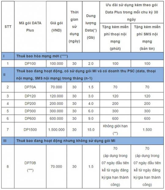 Tổng hợp thông tin gói cước 4G của Mobifone cho từng loại thuê bao khác nhau.Với gói cước thấp nhất là DP70, người dùng sẽ nhận được 1,5 GB băng thông, và cao nhất là 15 GB dành cho gói DP1500. Ngoài ra, để thu hút thêm người dùng, nhà mạng này sẽ tặng kèm thêm nhiều phút gọi miễn phí nội mạng, tin nhắn SMS miễn phí và các dịch vụ giá trị gia tăng khác bao gồm miễn phí sử dụng Facebook, Youtube (qua website, ứng dụng) và các dịch vụ MobiFone TV, Mobi Clip, mMusic, mHDViet trong 30 ngày kể từ ngày đăng ký thành công gói cước Data Plus 4G.