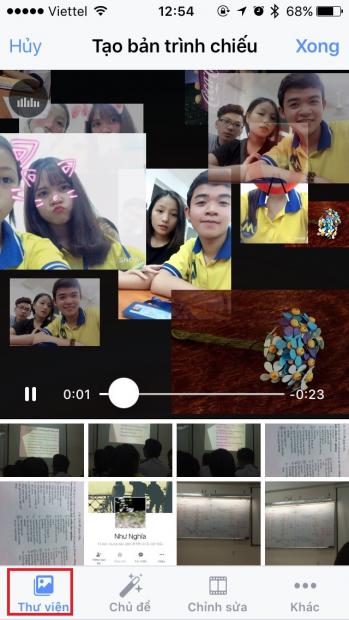 Tại đây, người dùng sẽ được đưa đến một giao diện hỗ trợ tạo video, bạn có thể thêm hay bớt các bức hình qua tùy chọn Thư viện.