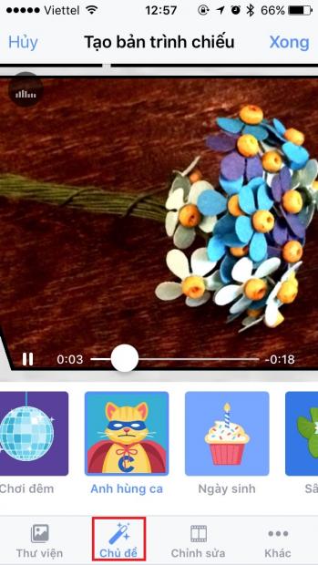 Với tùy chọn Chủ đề, Facebook cung cấp một số chủ đề mẫu để video của bạn được thú vị hơn như Thung lũng, khôi hài, đua xe,… Với mỗi chủ đề khác nhau, người dùng sẽ được cung cấp các hiệu ứng liên kết hình ảnh, các đoạn âm thanh khác nhau, phù hợp với chủ đề đã chọn.