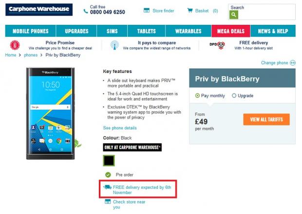 Theo đó, nhà bán lẻ tại Anh Carphone Warehouse đã chính thức cho phép đặt hàng trước mẫu smartphone BlackBerry Priv, mức giá được liệt kê là 75USD/tháng (theo hợp đồng nhà mạng) và hàng sẽ tới tay người dùng từ ngày 6/11 tới.