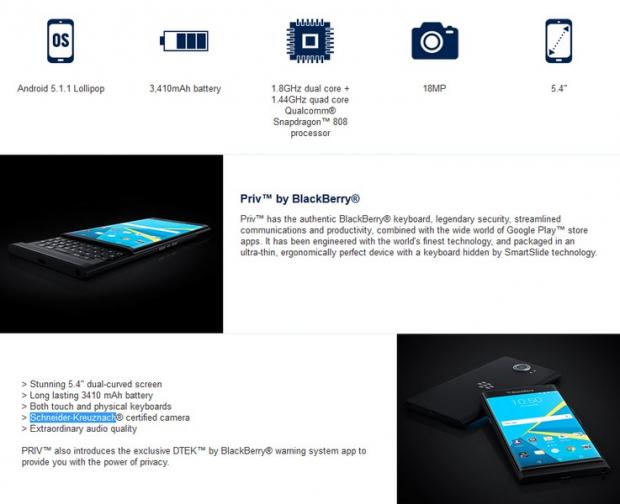 Cũng theo nhà bán lẻ này, BlackBerry Priv có màn hình 5.4 inch độ phân giải 1.440 x 2.560 px sắc nét, bên trong là vi xử lý Snapdragon 808 với 2 lõi 1.8GHz và 4 lõi 1.44GHz, đồ họa Adreno 418. Thiết bị có RAM 3GB, bộ nhớ trong 32GB và hỗ trợ thẻ nhớ lên tới 2TB.
