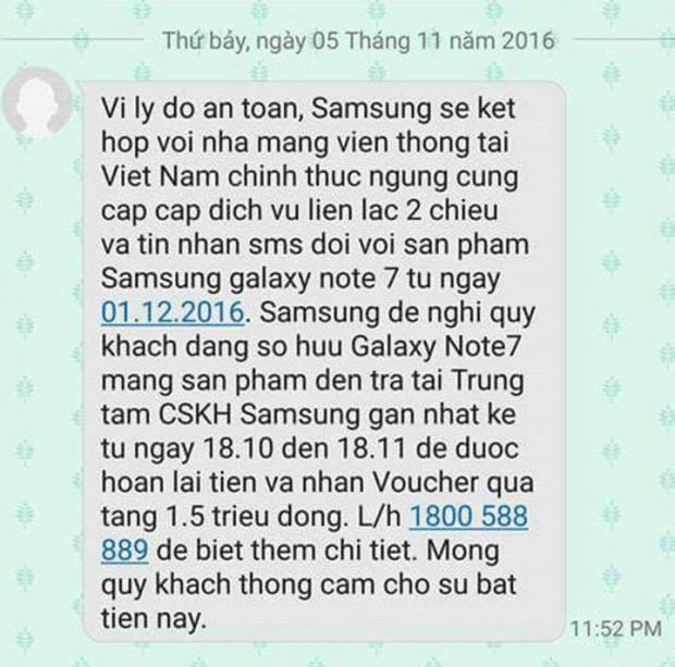 Theo đó, vào đêm qua (5/11), những người dùng Galaxy Note 7 tại nước ta đã bất ngờ nhận được tin nhắn với nội dung: “Vì lý do an toàn, Samsung sẽ kết hợp với nhà mạng viễn thông tại Việt Nam chính thức ngừng cung cấp dịch vụ liên lạc 2 chiều và tin nhắn SMS đối với sản phẩm Galaxy Note 7 từ ngày 1/12/2016. Samsung đề nghị quý khách đang sở hữu Galaxy Note 7 mang sản phẩm đến trả tại Trung tâm CSKH Samsung gần nhất kể từ ngày 18/10 – 18/11 để được hoàn tiền và nhận Voucher quà tặng 1.5 triệu đồng. Liên hệ 1800 588 889 để biết thêm chi tiết. Mong quý khách thông cảm cho sự bất tiện này”.