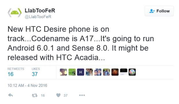 Nếu bạn còn nhớ, HTC A16 chính là Desire 530, vì vậy dự kiến HTC A17 cũng là một sản phẩm nâng cấp và cũng nằm trong phân khúc giá rẻ. Hiện chưa rõ thông số cấu hình của A17 ngoài thông tin mà tài khoản Twitter LlabTooFeR cung cấp, đó là chạy Android 6.0.1 với giao diện Sense 8.
