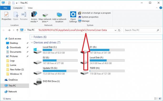 Bước 2: Nhập vào thanh địa chỉ: %USERPROFILE%AppDataLocalGoogleChromeUser Data.