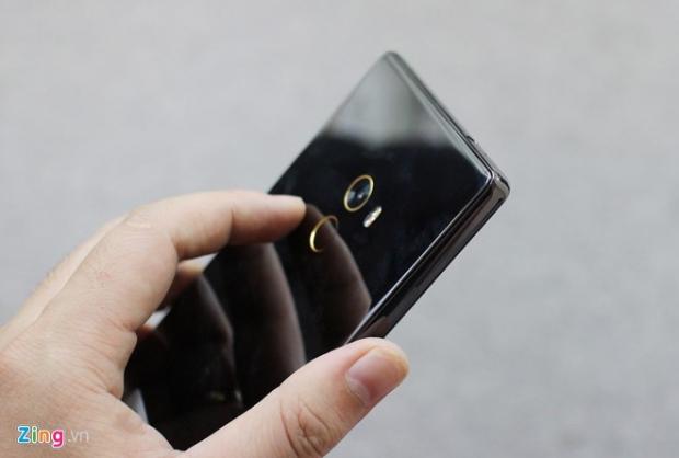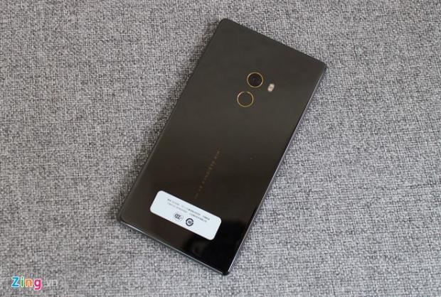 Mi Mix sử dụng mặt lưng bằng chất liệu gốm, tạo cảm giác cao cấp. Viền của máy cũng được làm đen bóng, hợp tông với lưng máy. Phần viền camera và cảm biến vân tay có màu vàng, tạo điểm nhấn.